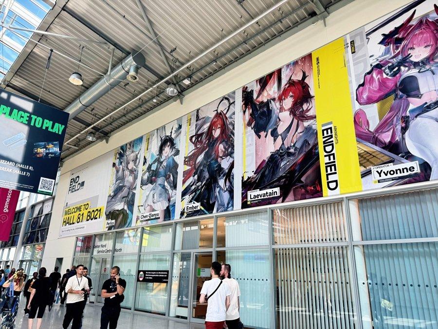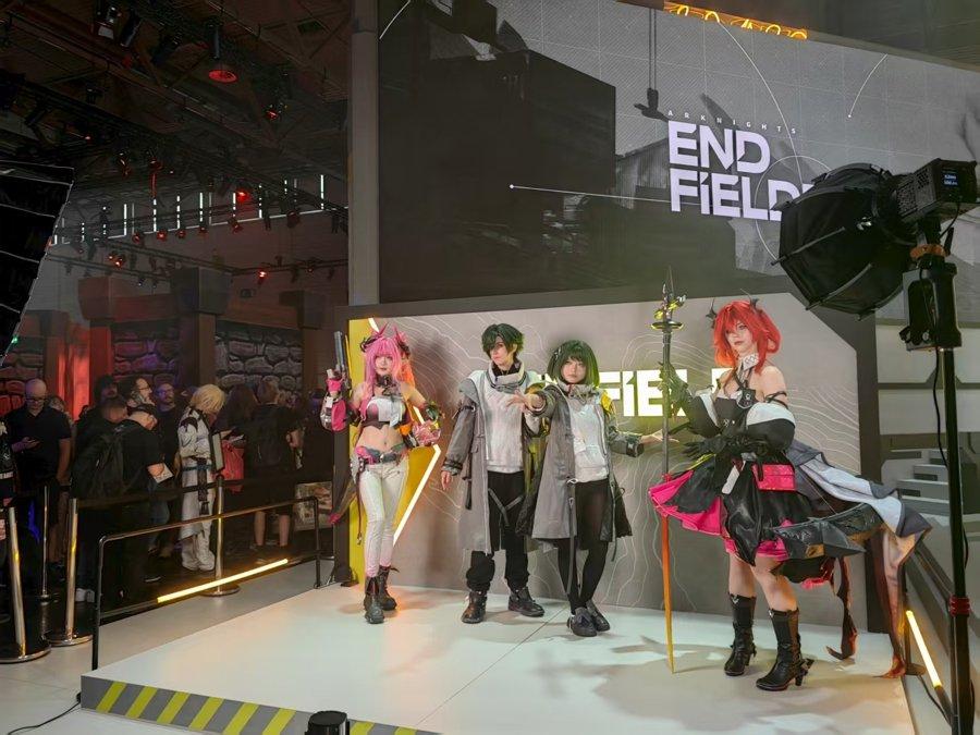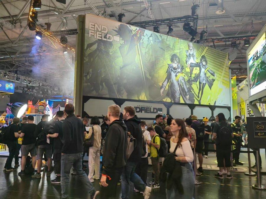 《山外山》展台 在独立游戏和新游戏展区,青庖游戏展示的《山外山》是一款计划于2027年发售的开放世界沙盒游戏,前不久在B站首次曝光预告片。“选择在科隆展线下第一次亮相,是为了收集更多专业玩家和同行及媒体的反馈。”上海青庖网络创业合伙人Alex在展台前不停地和海外玩家交流试玩体验。《山外山》的世界观根植于中国上古奇书《山海经》,背景设定在夏商周时期,核心玩法是“高交互”,环境会实时深刻地影响玩家的生存,“这是一款生存压力与休闲并行的游戏,希望玩家能在这个世界里长时间获得趣味性体验,也愿意发呆两三个小时在游戏中看风景。” 鹰角网络《明日方舟:终末地》展台成为全场的焦点之一,展台将游戏中的元素巧妙融入其中,步入其中,仿佛踏入了游戏中危机四伏却又充满希望的塔卫二世界。周围环境的布置,从荒芜壮阔的异星地貌到充满未来感的工业设施,都高度还原了游戏内的场景,让玩家瞬间沉浸在《明日方舟:终末地》独特的世界观里。巨大的屏幕上循环播放着游戏的宣传影片,展示着流畅的人物动作、酷炫的战斗特效,引得过往玩家纷纷驻足观看。