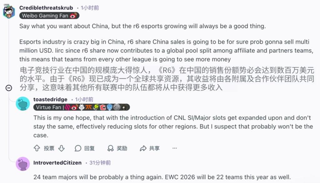 竞技层面之外,CN赛区在商业生态上的布局同样引人关注。 还是那篇Reddit,有人很快地算了一笔账,认为《彩虹六号:攻势》在中国市场的规模会达到数百万美元的水平,中国电竞市场的庞大体量是显而易见的,CN赛区的加入意味着整个联盟生态都将受益于这片市场的流量与商业增量。更重要的是,R6 SHARE的全球共享分红机制,意味着CN市场带来的收益将惠及所有联盟成员。